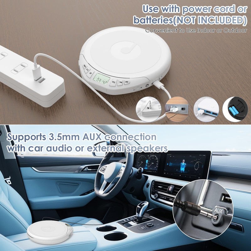 • ASP function for sports or car: the CD player for car supports the ASP anti-shock system, it can prevent the interruption of CD playback in case of vibration, listen to your favorite CDs at any time and never miss a beat. If you want to use it in the car, you need an AUX cable (included). Please make sure your car radio supports AUX input and output.