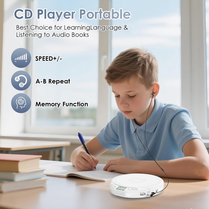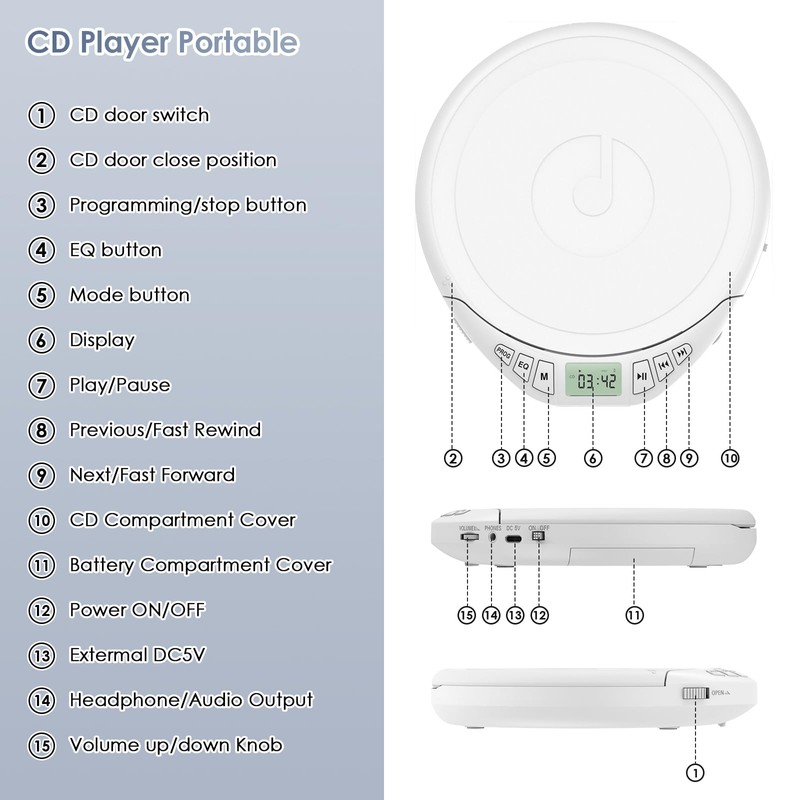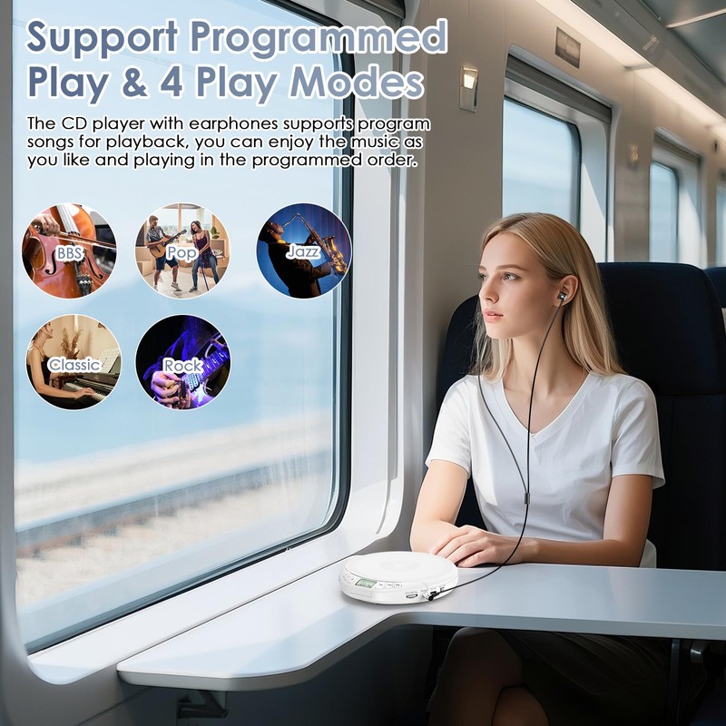 • Programmed playback & memory function: the CD player with headphones supports programmed playback of songs, you can enjoy the music as you like and in the programmed order. Turn off the player with the power button, the playback will resume where it was last paused.