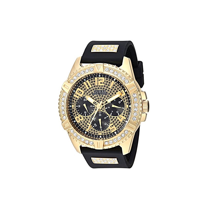 GUESS Comfortable Gold-Tone Black Stain Resistant Silicone Watch with Crystal Embellished Day, Date + 24 Hour Military/Int'l Time. Color: Black (Model: U1132G1)