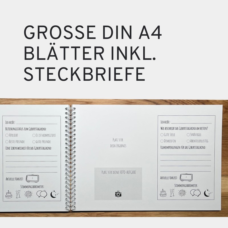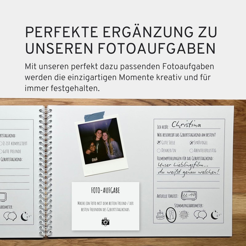 Capture the most beautiful moments of your birthday party in a very special keepsake! Our high-quality photo guest book is the perfect addition to our photo tasks and offers your guests the opportunity to stick their most creative snapshots directly. Complemented by personal entries in the lovingly designed profiles, a unique book full of memories, funny moments and warm words is created.