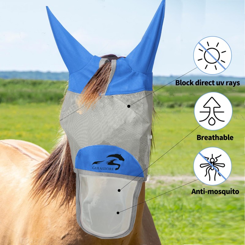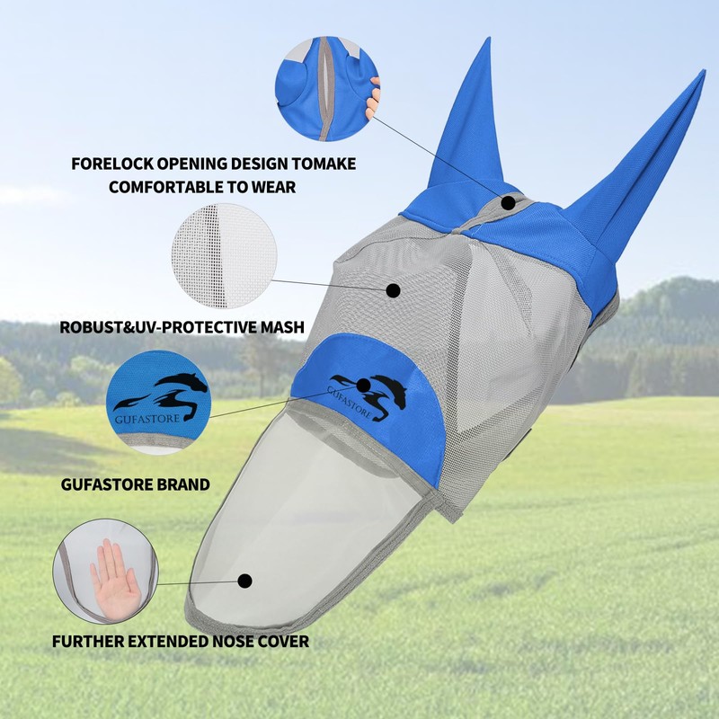 Gufastore Horse Fly Mask with Long Nose and Ears,Blue,Large Size