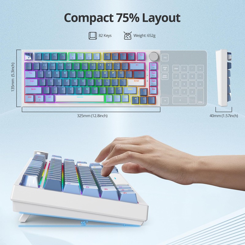 Guffercty kred 75% Percent Blue Keyboard Gasket Mount with Knob, Hot-swappable RGB Wired Mechanical Gaming Keyboard Programmable for Mac/Win (82 Sea Fog Blue)