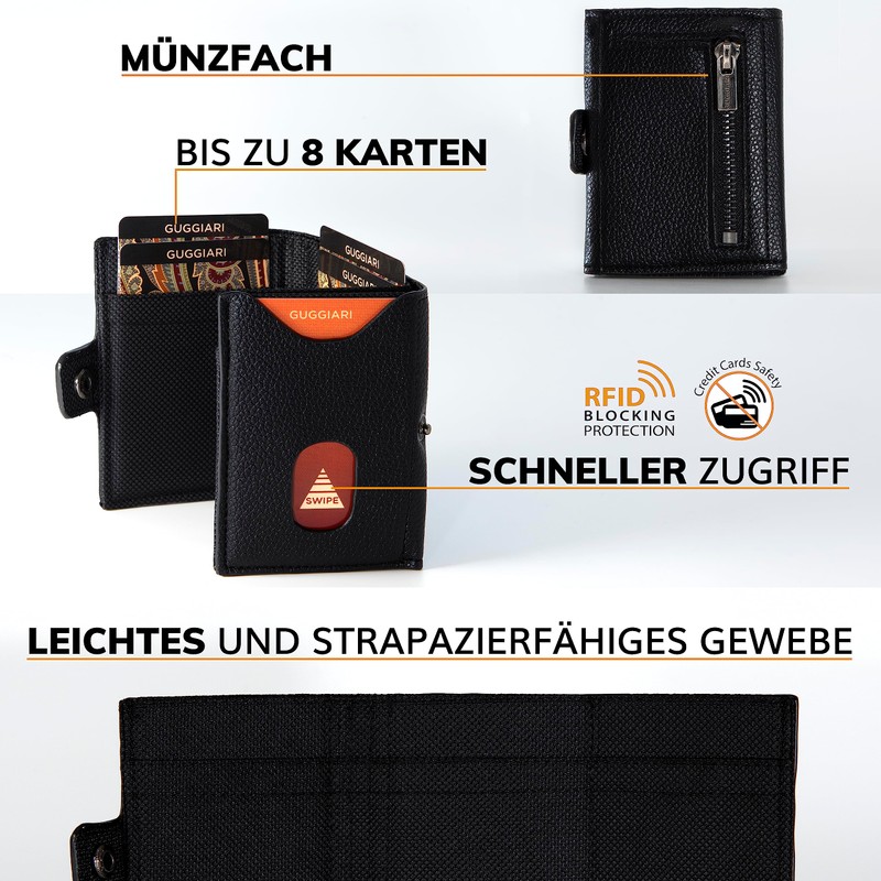 - PRATICO - Il Portafoglio Slim Guggiari è realizzato in morbida e resistant pelle PU, con interno in elegant tessuto, può stare comodamente nella tasca anteriore o posteriore dei tuoi pantaloni ed ospitare fino a 8 tessere (6 all 'interno e 2 All esters! no), banconote di tutte le dimensioni e un capiente wallet