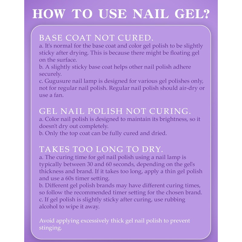 - [WIDE COMPATIBILITY] Gugusure Portable UV light for nails has a large hand compartment and a great light bead distribution for flawless, even, and fast curing of all five nails at a go. Fast curing with all your favorite nail gel brands from beginner to professional grades. You can use it for UV LED gels, hard gels, builder gels, sculpture gels and so on . Confirm the exact curing time of each of the nail polishes, bases, top coating, and gels on the product packaging.
