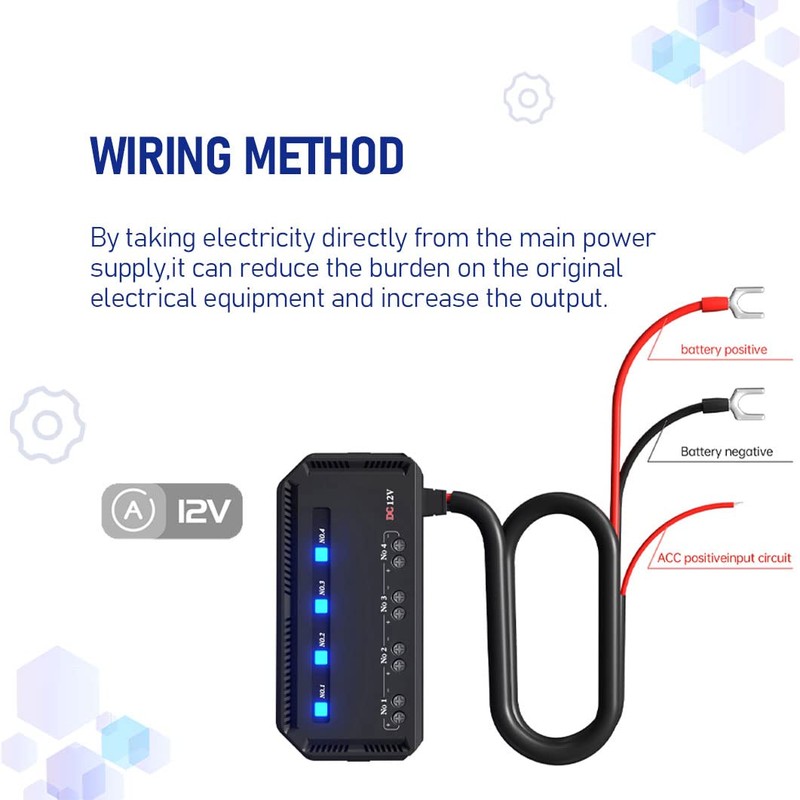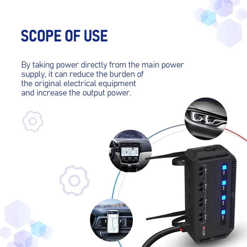 - 20A High Output: By taking power directly from the main power supply, it can reduce the burden of original electrical equipment and increase the output at the same time.