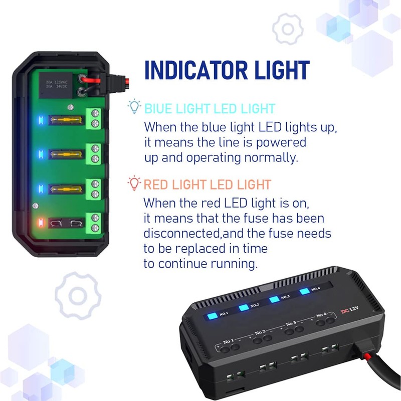 - LED Indicator Design: The LED indicator corresponds to each fuse connected to the electrical appliances, when the line is in normal operation, the indicator light is blue; when the fuse is disconnected, the red light will on, then you can immediately know which fuse is broken, to facilitate timely processing.