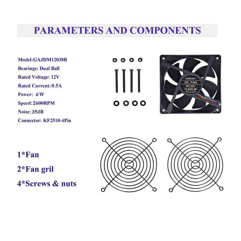 - One package includes: 1Pcs 120mm X 38mm fan, 2pcs grills, 4pcs screws & nuts.