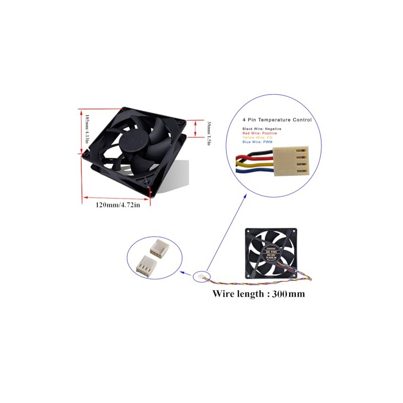 - Dimension: 12cm x 12cm fan or 4.72in (L) x 4.72in (W) x 1.5in (H); the distance between mounting holes is 105mm or 4.13in; connector: XH2.54, 2Pin, red wire is Positive(+) , Black Wire is Negative(-), same length of the two wire is 400mm or 15.7 inch.