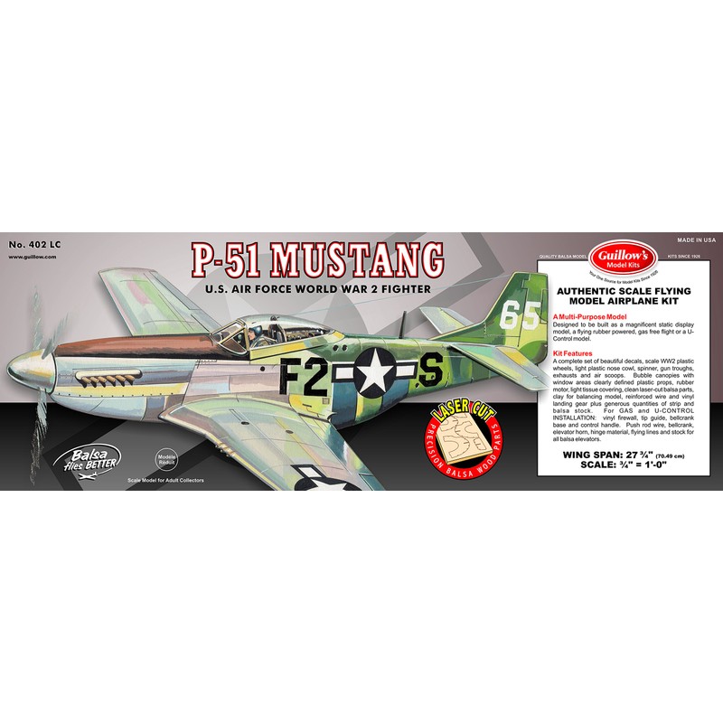 The U. S. Air Force's P-52 Mustang has a 27.75" wingspan. The North American P-51 Mustang was probably the best all-around single-seat piston engine fighter to be used in World War 2. The first U.S.A.A.F. combat group arrived in Britain in November 1943 and from then until the end of the war, the P-51 earned an enviable reputation as a long-range fighter-escort for the B-17 and B-24 bombers raiding deep in the heart of the German homeland. • Precision laser cut balsa parts, scale WWI plastic wheels, full set of decals, vacuum formed plastic parts and all accessories needed • Perfect for rubber power, U-Control and free flight as well as for display • Complete instructions for building either to fly or for static display