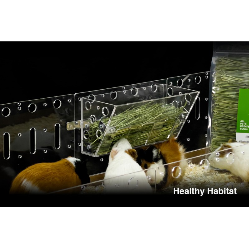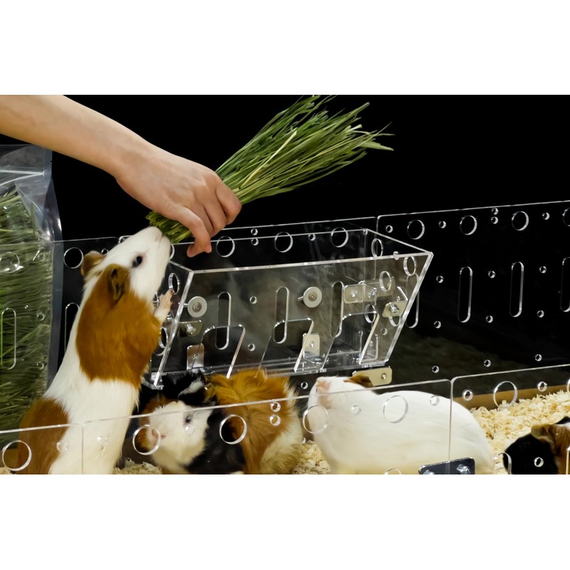 - Our hay feeder is securely fastened on the cage wall with brackets and screws, saving space and eliminating the risk of being knocked off.