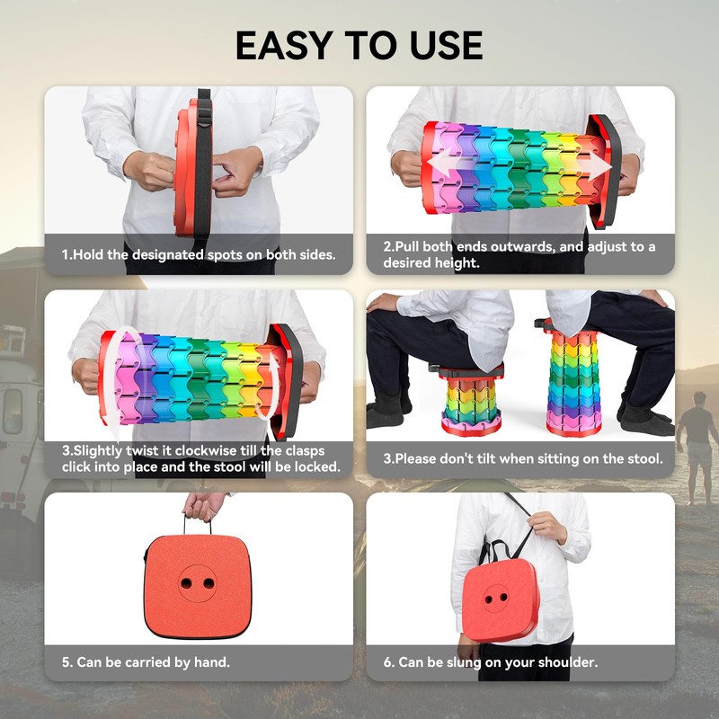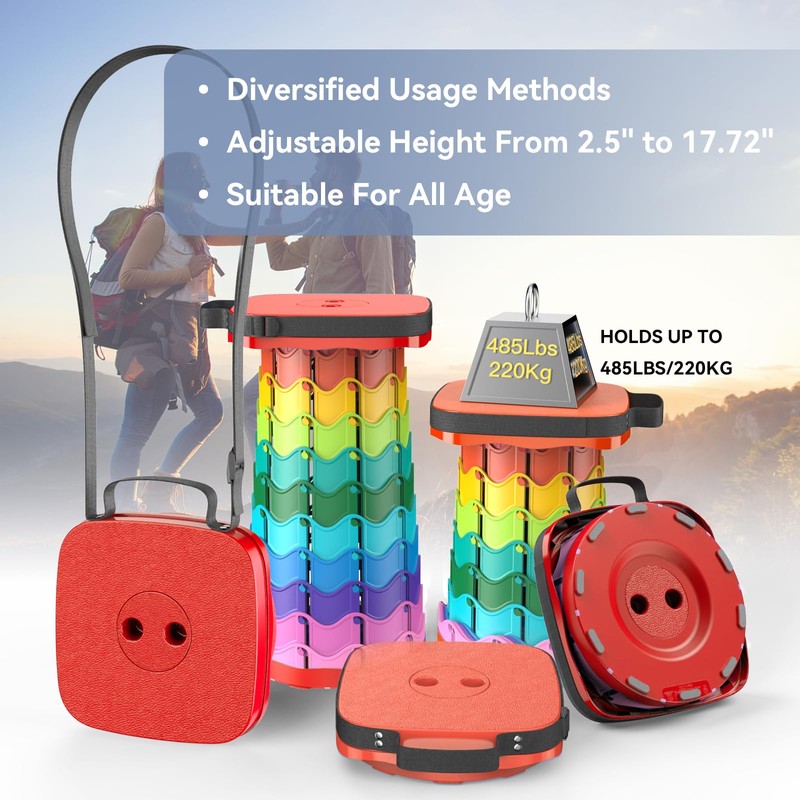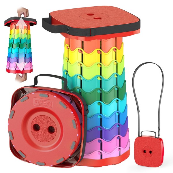 Guioiby Upgraded Collapsible Stool, Portable Folding Stool, Telescoping Camping Chair with Max Load Capacity 485lbs, Square Retractable Stool for Camping Gardening Fishing Hiking BBQ [Rainbow+Red]