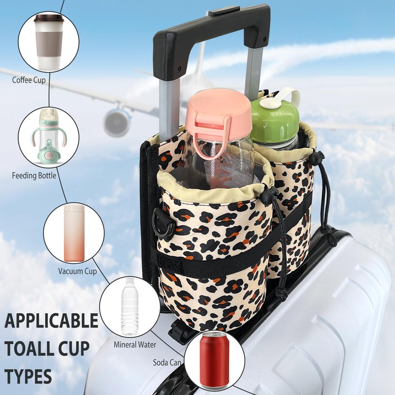 GuirCygne Travel Cup Holder for Luggage – Robust Reliable, Secure Convenient, 2-Cup Capacity, Fit Most Roll-on Suitcases, Heavy-Duty Waterproof Easy to Install, Perfect for Frequent Travelers Leopard
