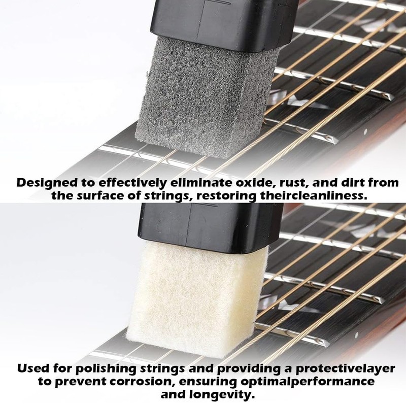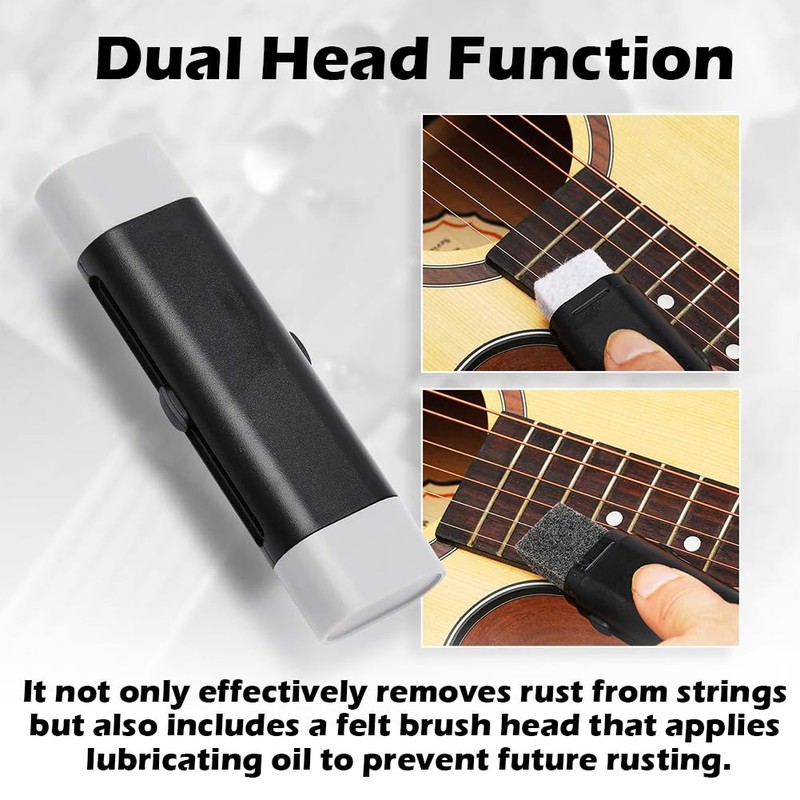 - 2 Styles Guitar String Cleaner - Dual headed design not only effectively removes rust from strings also includes a felt brush head that applies lubricating oil to prevent future rusting. Another 360°clean on your guitar or bass,more efficient and save your time.