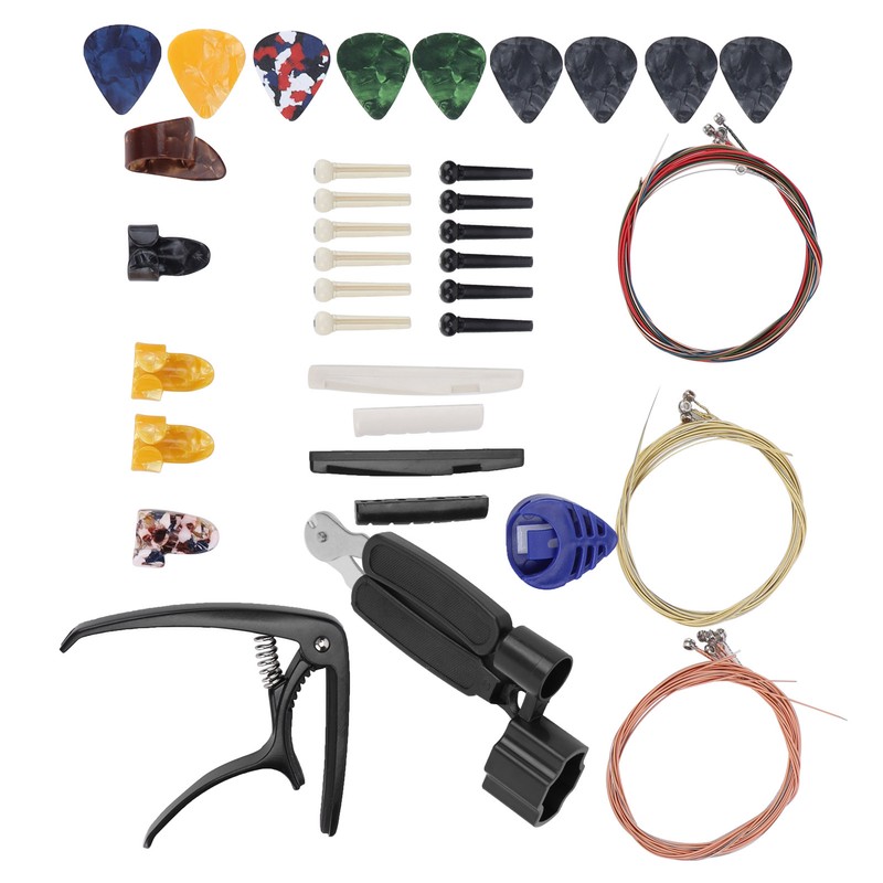 1、3 string sets have 18 strings in total, and all the strings have unique anti-rust coating, durable and practical. 2、Guitar capo is a common and necessary tool used in guitar playing, it can be easily repositioned with one hand to switch between characters. 3、The string winder and cutter can effectively pull, wind and cut the strings, making the repairing much easier. 4、Including 9 picks, 4 finger picks and so on, and all the picks will play a warm and round sound. 5、Guitar nut set is made of premium material, and it will fix the guitar strings in the proper position. 6、This guitar can be used on various instruments, including acoustic guitar, folk guitar, ukulele, etc.