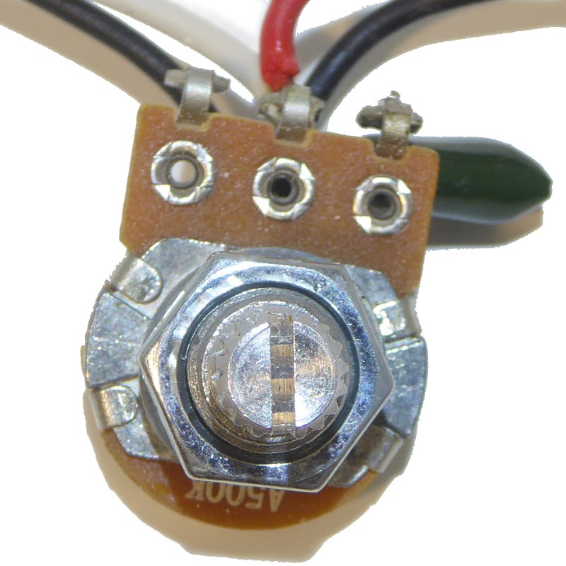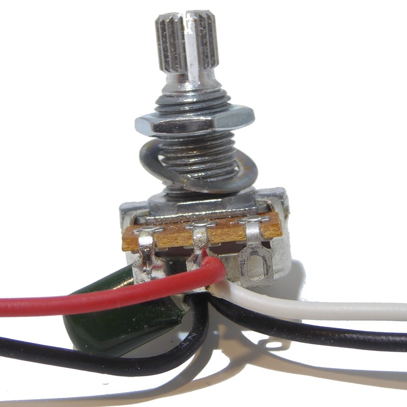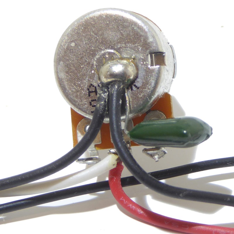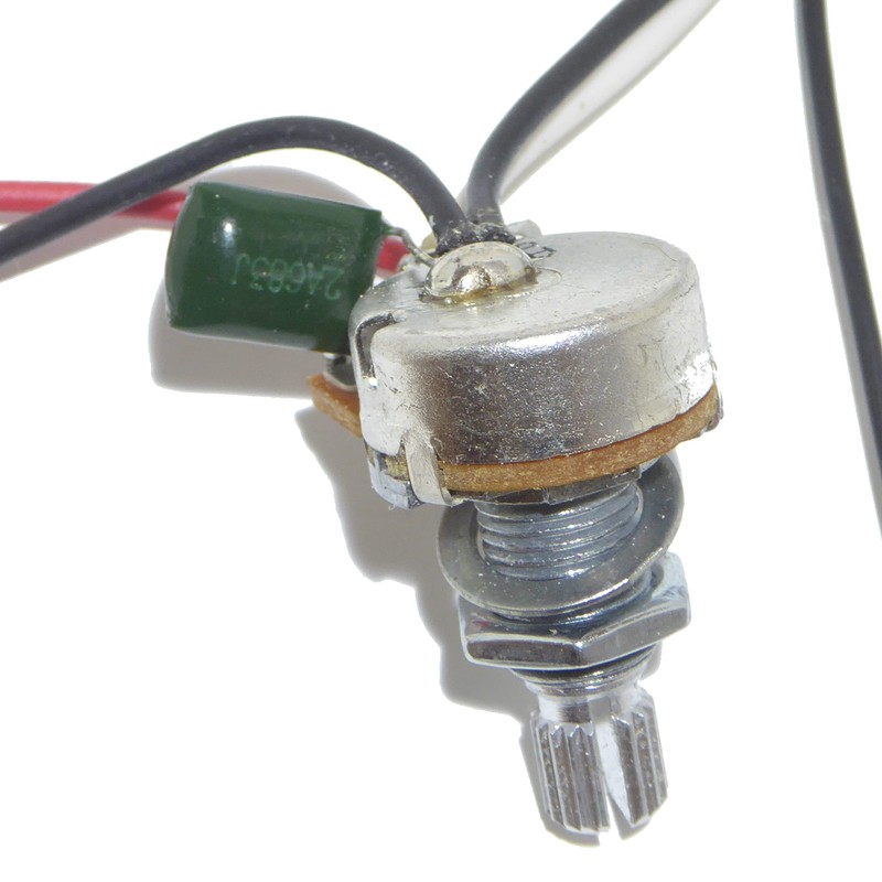 Guitar wiring assembly two volume and one tone. Pre-wired kit includes 2 x B500K Potentiometers (pots include locking nuts) 1x A500K Potentiometer 1x Capaciter