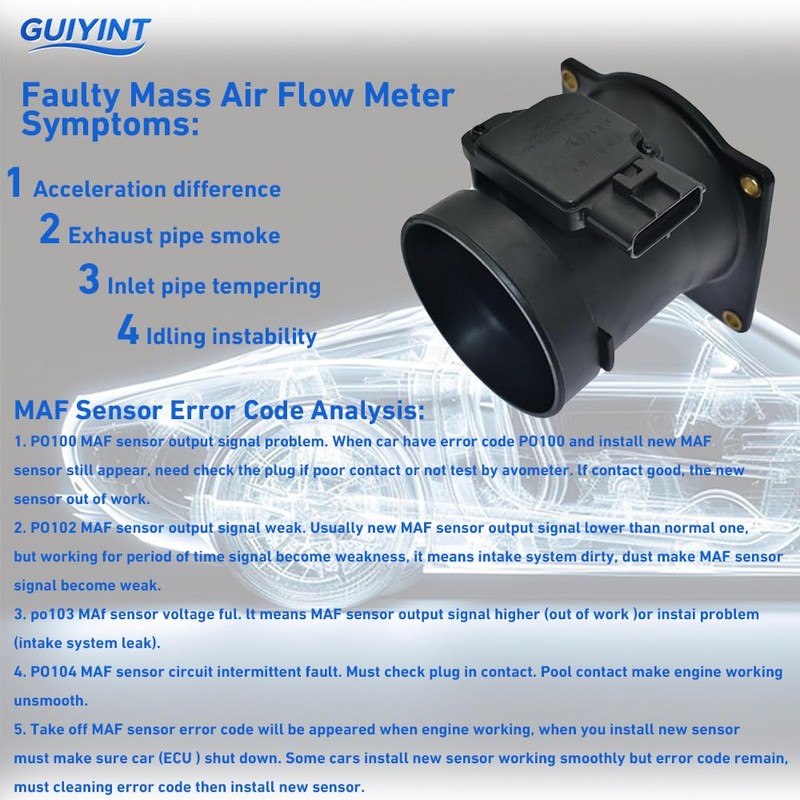- Mass Air Flow Meter MAF Sensor measures the volume and density of air entering the engine, providing highly accurate airflow readings to the ECU over a wide range of ambient temperatures.【NOTICE】 Please clean out the air box and replace the air filter before installating this Mass Air Flow Sensor Meter, or the Code and Check Engine Light may keep showing even if you replace a new MAF.