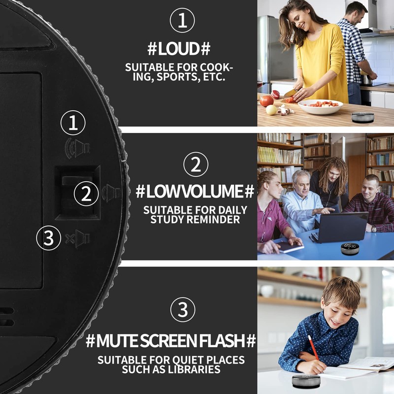 - Volume Adjustable: 3 levels alarm sound mode, Loud (80-90dB), Soft (60-75dB) and a Mute level, ideal as a kitchen timer, no more worry about overcook, say goodbye to underdone burgers and overcooked steaks.