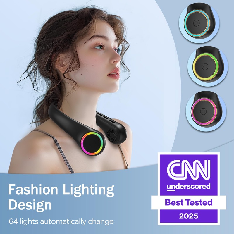 - 【Stylish Lights】The addition of 64 cool auto-changing lights (long press for 3 seconds) adds a touch of irresistible fashion charm to the personal fan. Not only does it increase the fun of using it, but it can also perfectly match every kind of your outfit.