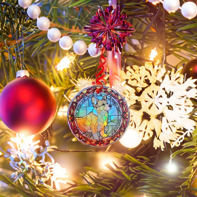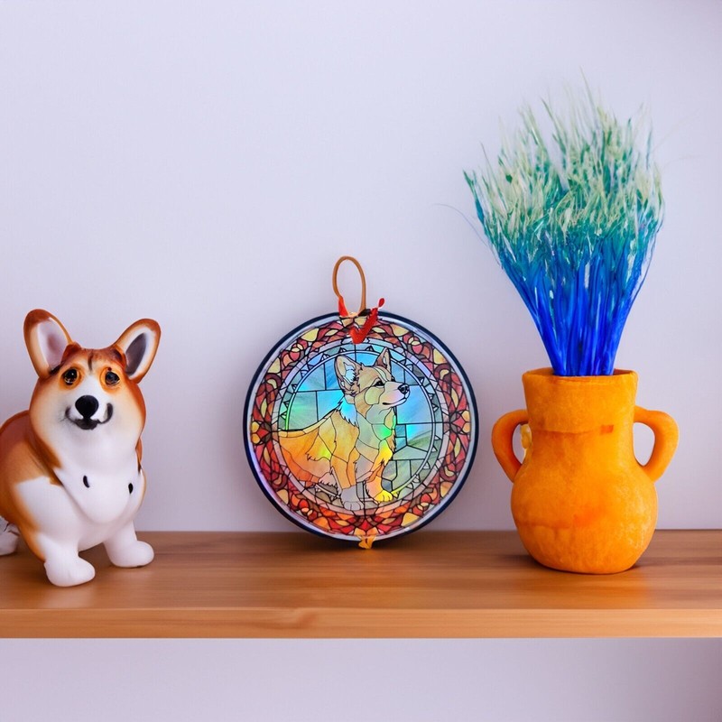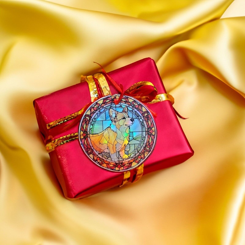 This is a 3.5 inch diameter Pembroke Corgi 3 ornament that is printed on a holographic plastic material. Move the ornament in the light and the colors of the image shimmer and reflect the light and seem to change colors. The Pembroke Corgi Image is on one side and the dog paw image is on the other side.