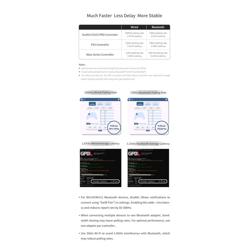 - WORLD FASTEST WIRELESS SPEED: Featuring GuliKit Hyperlink 2 revolutionary wireless dynamic channel selection technology, delivers the world lowest 3.25ms delay with 730Hz polling rate in Bluetooth mode on PC, and the lowest 1.87ms delay with 1000Hz polling rate in wired mode. With the legit breakthrough in wireless tech,it offers the world fastest speed and e-sports-level responsiveness.