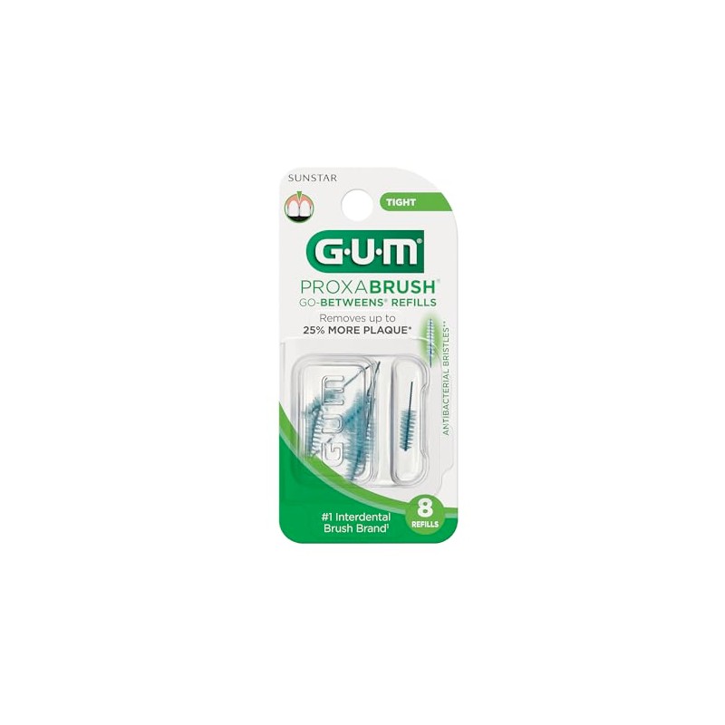 Product DescriptionGo beyond brushing with GUM Proxabrush Go-Betweens. Between-teeth cleaning is essential for removing plaque from hard-to-reach areas that are missed by brushing alone....But tight teeth, difficulty gripping floss, and a simple lack of time prevent many of us from flossing as often as we should. GUM Proxabrush refills are compatible with both the GUM permanent handle and the GUM dual-ended-handle. Our permanent handle dental cleaners are designed by dental professionals to offer a quick, easy, and effective alternative to flossing. With GUM Proxabrush Go-Betweens, cleaning the hard-to-reach areas in your mouth has never been easier. A non-slip rubber handle makes it easy to maneuver to the back of the mouth. Each brush comes with nylon coated wire that cleans around braces, bridges, implants, and other dental devices without the risk of scratching or galvanic shock. Our tight floss brush refills are specifically made to remove plaque and food particles from tight interdental spaces. Each floss brush is treated with a hygienic solution that allows for up to ten days of use.Manufacturer Contact Information1-888-777-3101
