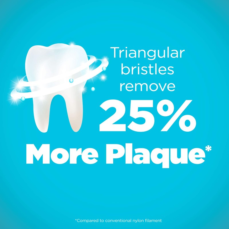 - The unique triangular-shaped bristles remove up to 25% more dental plaque than traditional round bristles.