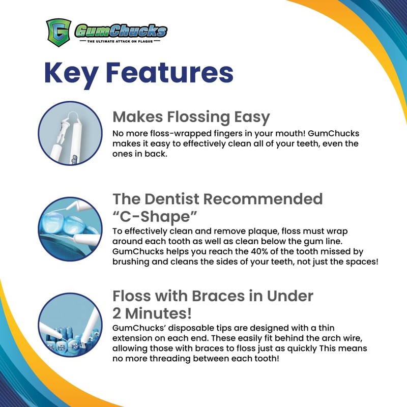 - Floss and Toss - Simply press the button to release the old floss pick. Independent Study demonstrated that GumChucks makes flossing so easy and fast, that 73.7% of people who tried GumChucks became regular daily flossers!