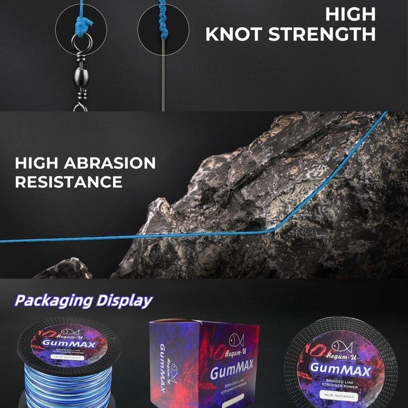 - Excellent Material: GUMMAX braided fishing line uses 8 super strong PE (polyethylene) strands. Through professional processing technology, the fishing wire's tight-knitted structure, smooth and durable characteristics, and strength are stronger than those of the traditional 4-strand PE fishing line and are not easy to loosen.