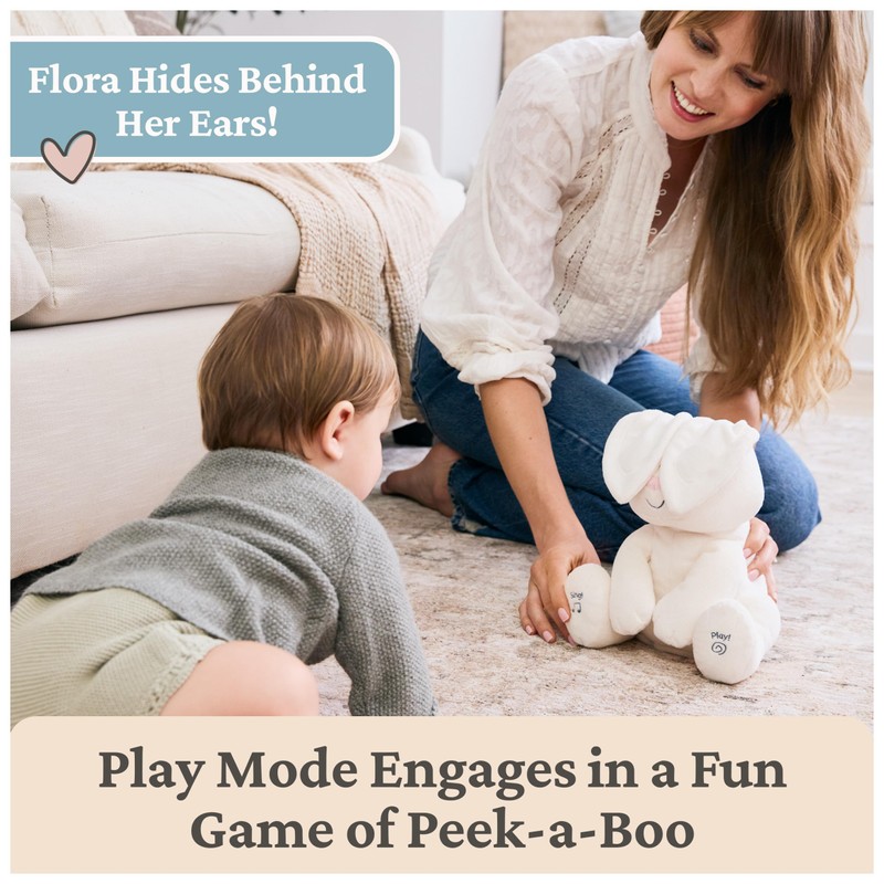 - INTERACTIVE PLAY: Press Flora’s left foot to engage her in a game of peek-a-boo, where Flora hides behind her soft, oversized ears. Press her right foot to sing along to a playful new song in a cute child’s voice while her ears flap to the rhythm