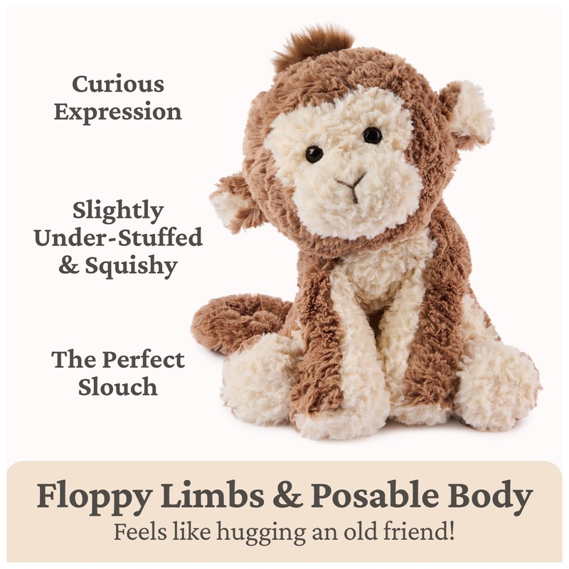 Cozys are cuddly companions made from soft, textured fabrics that feel as familiar as hugging an old friend! At 10 inches long, this monkey has soft mocha-hued fur, cream-colored accents, and floppy limbs built for hugging. Its long, curly tail and the wispy tuft of plush on top of its head give this adorable plushie its undeniable charm. This playful pal is also understuffed and floppy, making it delightfully posable and extra-squishy. Its bean-filled paws also help keep it balanced in the classic Cozys pose. Like all animals in the collection, the Cozys monkey’s high-pile fur is specially rippled and textured to make holding on during play easier and make big hugs feel even sweeter. This Cozys monkey is made for snuggle sessions! Appropriate for ages 1 and up. Ships in a protective poly bag. Do not machine-wash. Explore the animal kingdom with GUND! At the heart of GUND is our collection of stuffed animals and plush toys, bursting with unique designs and personalities. Each plush is made with pride from super-soft, huggable materials that stay supple through the years. From established classic favorites to brand-new modern pals and squishy toys, there’s a GUND plush for everyone!