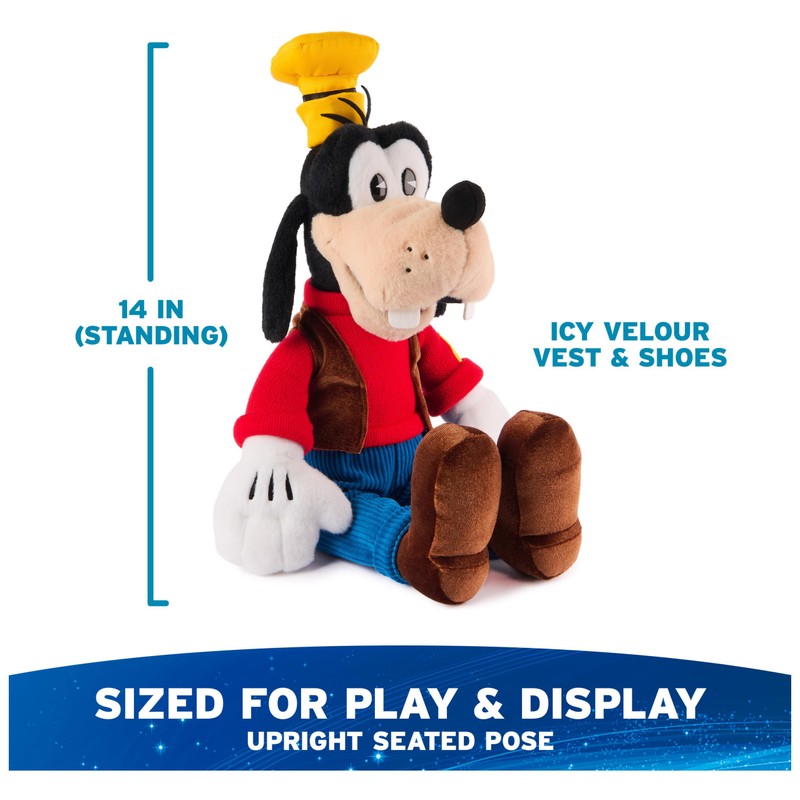 - DELUXE GOOFY PLUSH: This soft 14” plush features Disney’s Goofy dressed in deluxe fabrics: blue corduroy pants, a red knitted turtleneck sweater, a velvety brown vest, and matching shoes. He also has long, floppy ears and a yellow hat with black satin lining