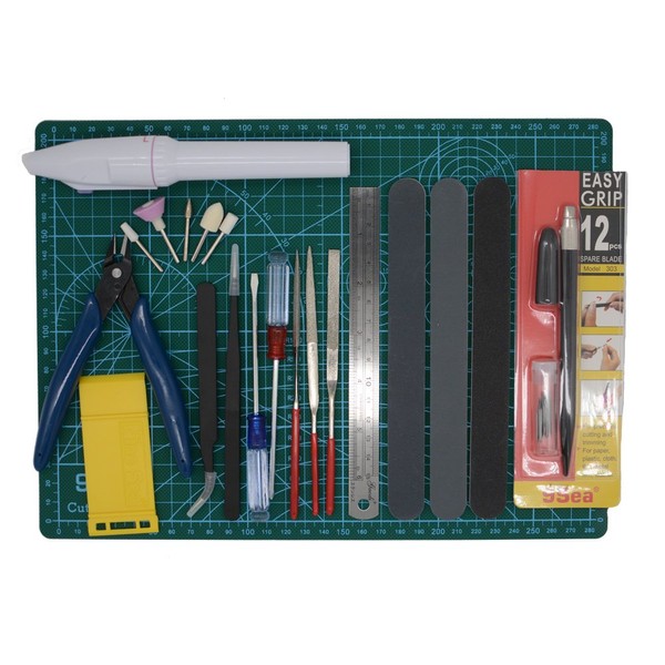 - 【Package】2 x tweezers (bent and straight); 1 x 9Seapen knife with Tapered handle plus 12 blades ; 3 x Sanding Sticks (6 different grits);1 x transparent box;1 x 9Sea part separator; 3 x metal files of differing shapes/angles: a flat, a rounded and an angled;2 x screwdrivers (phillips, flathead) ;1 x cutting mat.,1 x small rotary tool