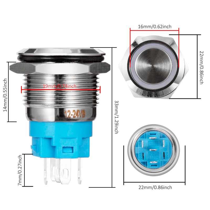- Current push button switch: 19 mm hole size of the panel installation, 16 mm push button diameter, press and hold: turn on, release fingers: turn off. Lifespan up to 100,000 cycles, enough for long time use.
