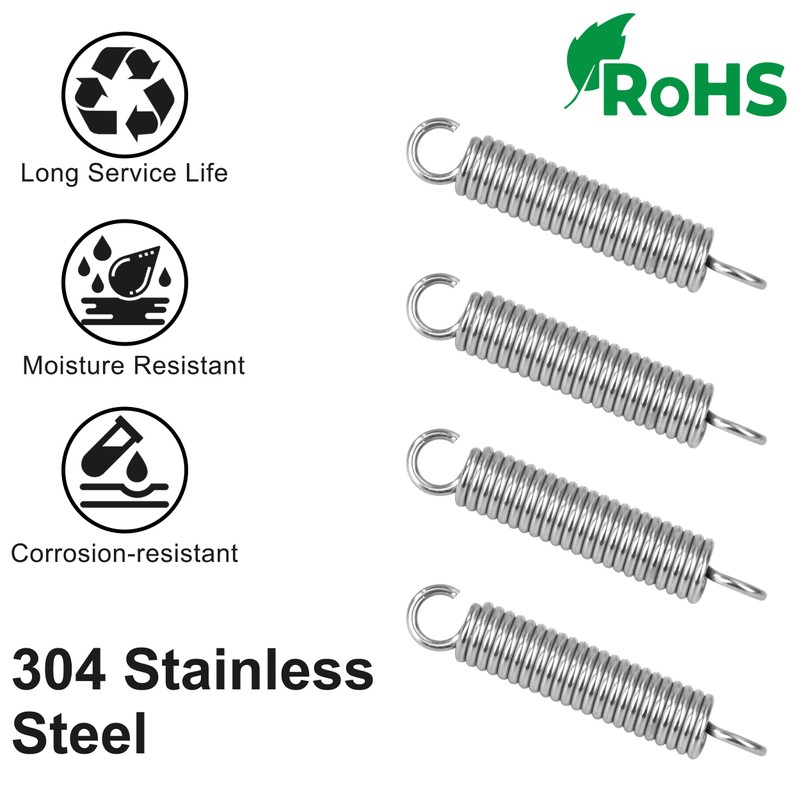 - STRONG AND ECO FRIENDLY Tension spring is made of Japan imported 304 stainless steel and complies with RoHS certification, rust and corrosion resistant, high strength and elasticity, long service life.