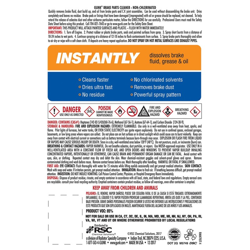 Ultra-fast drying, no chlorinated solvents, cleans and degreases brake linings, cylinders, drums, rotors, clutches, CV joints, leaves no residue