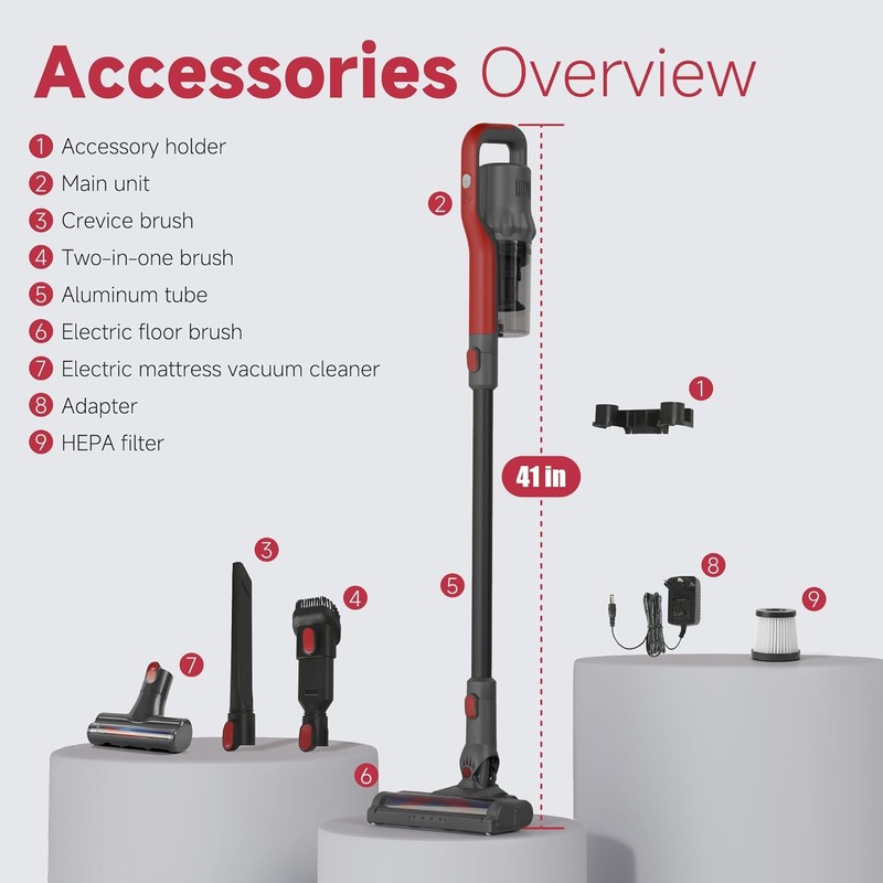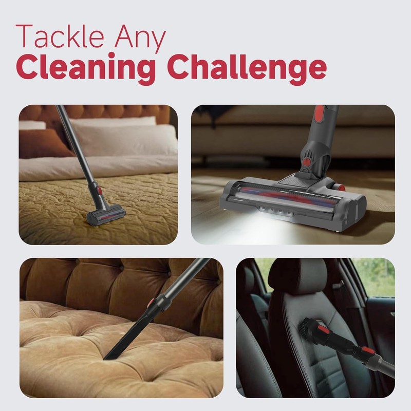 - LED-EQUIPPED ELECTRIC BRUSHES: The cordless stick vacuum includes an LED floor brush for dark areas. Use the crevice tool and 2-in-1 brush to convert it into a handheld vacuum cleaner for stairs, sofas, corners, and furniture gaps