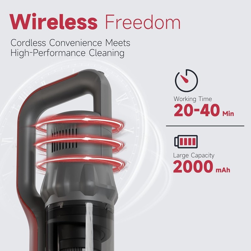 - POWERFUL DUAL MOTOR SUCTION: This cordless vacuum cleaner uses dual motors to deliver 45KPa suction, removing dust, pet hair, and debris from carpets and hard floors. Two modes make this stick vacuum cordless rechargeable ideal for any surface