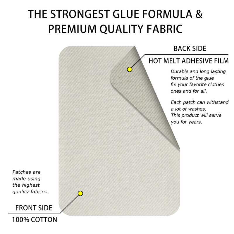 Package Includes:12 iron-on fabric patches, size 3" by 4-1/4" (7.5 cm x 10.5 cm).Front side of the patches is cotton, rear side is covered with the strongest hot-melt adhesive film. Patches made in EU using high quality materials.