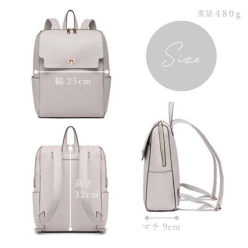 - This simple and beautiful backpack is perfect for everyday use, commuting to work or for holiday outings. The main entrance opens wide with a smooth double zipper for easy viewing of contents and smooth storage and removal. Safe for work situations. The front flap has a pocket that can be opened and closed with a single touch. The gold parts are one of the highlights and add a sense of luxury. There are pockets on both sides, so it is convenient for storing your cell phone or commuter trips. Ultra Light!
