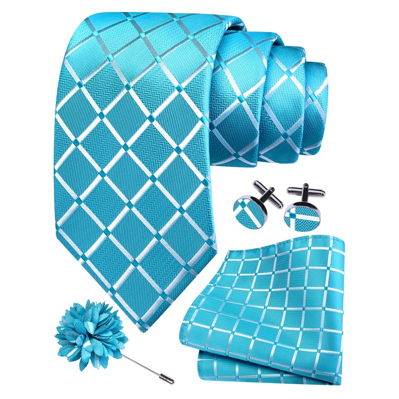 GUSLESON Mens Turquoise Blue Tie and Lapel Pin Silk Plaid Checkered Necktie Hankerchief Cufflinks Set for Wedding (6104-38)
