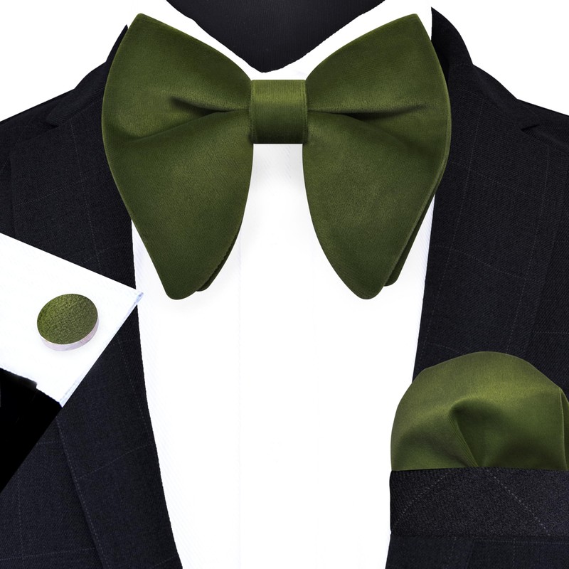 GUSLESON Over Size Olive Green Bow Ties For Men Velvet Pre-tied Big Bowtie and Pocket Square Cufflinks Sets Adult Gifts (0571-32)