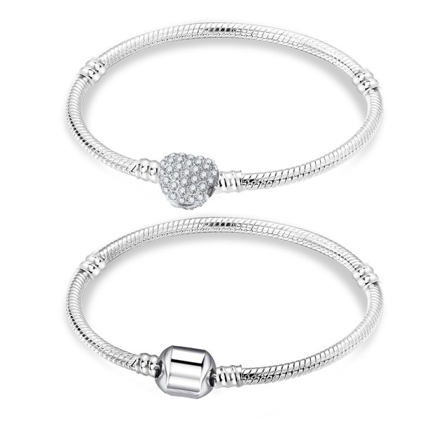 GUSXPPD Pack of 2 Heart Snake Charm Bracelets, Silver Bracelet for Charms, 17/18/19 cm Silver Snake Bracelet, Snake Link Bracelet, Bracelets with Heart Clasp, Copper, No Gemstone