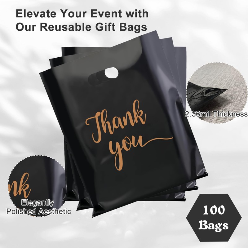- Bulk & Premium Quality: Elevate your packaging game with our Bulk 100 Premium Retail Bags. These durable, glossy black bags with gold "Thank You" lettering are perfect for a variety of occasions, such as parties, gifts, shopping, retail, merchandise, and more.