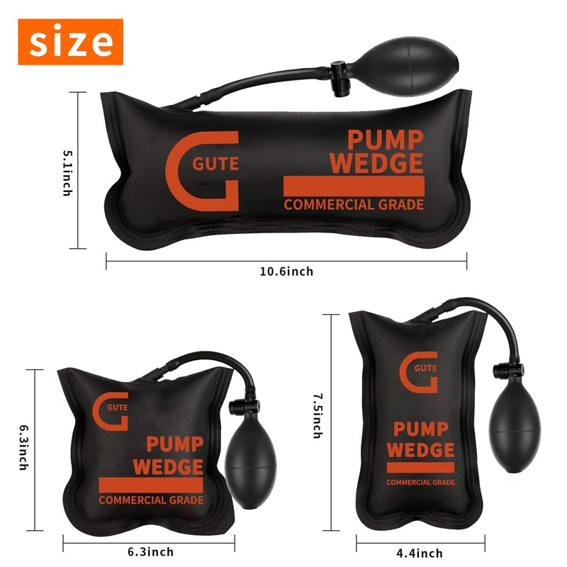 - Extensive use: contains 3 sizes of an inflatable air wedge for cars. Widely used for leveling furniture, cabinets, doors, windows and cabinets. Replaces damaged lever bars and wood discs.
