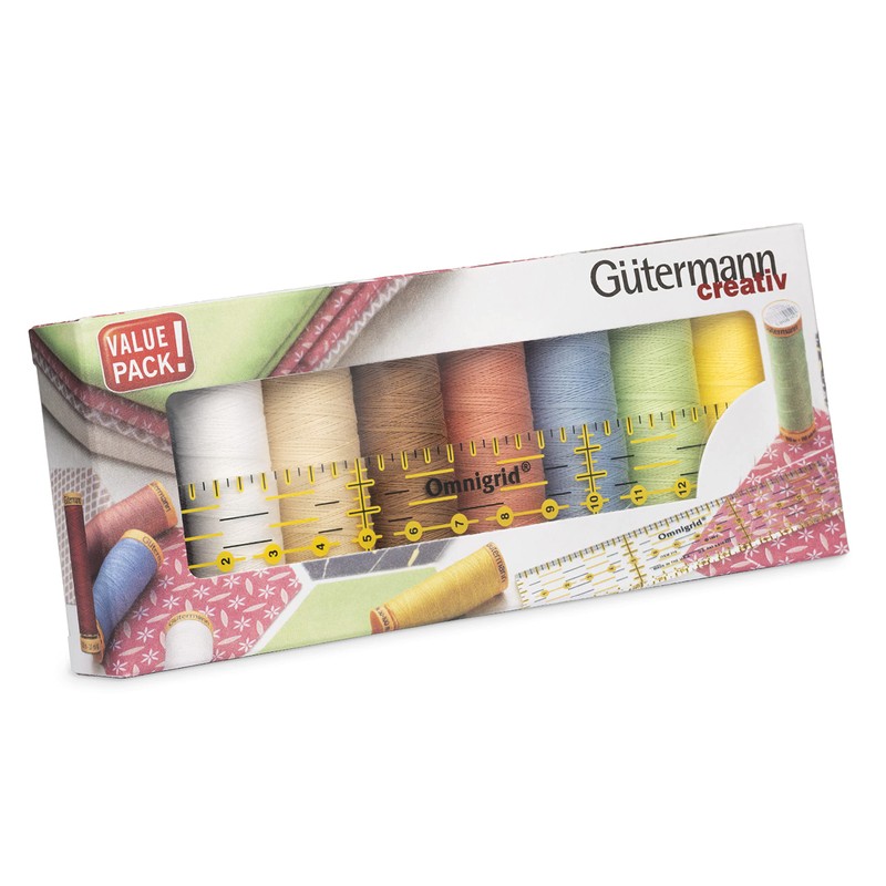 - 8 spools of cotton C Ne 50 100 m in bright colours, complemented by an Omnigrid universal ruler, 3 x 15 cm. For safely guiding rotary cutters and drawing knives when patchworking and quilting. Especially suitable for marking graphic shapes in patchwork area. The scratch-resistant yellow/black grid print allows accurate markings on both dark and light fabrics and materials. Transparent with metric scale.
