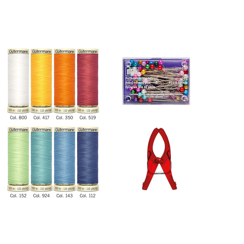 - 8 spools of all-purpose sewing 100 m in cheerful colours and practical helper for inserting and stapling. With the colourful Prym pearl head pins made of hardened steel and 15 practical fabric clips for sensitive materials. Plug and staple quickly and easily