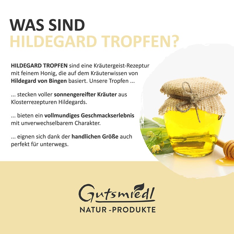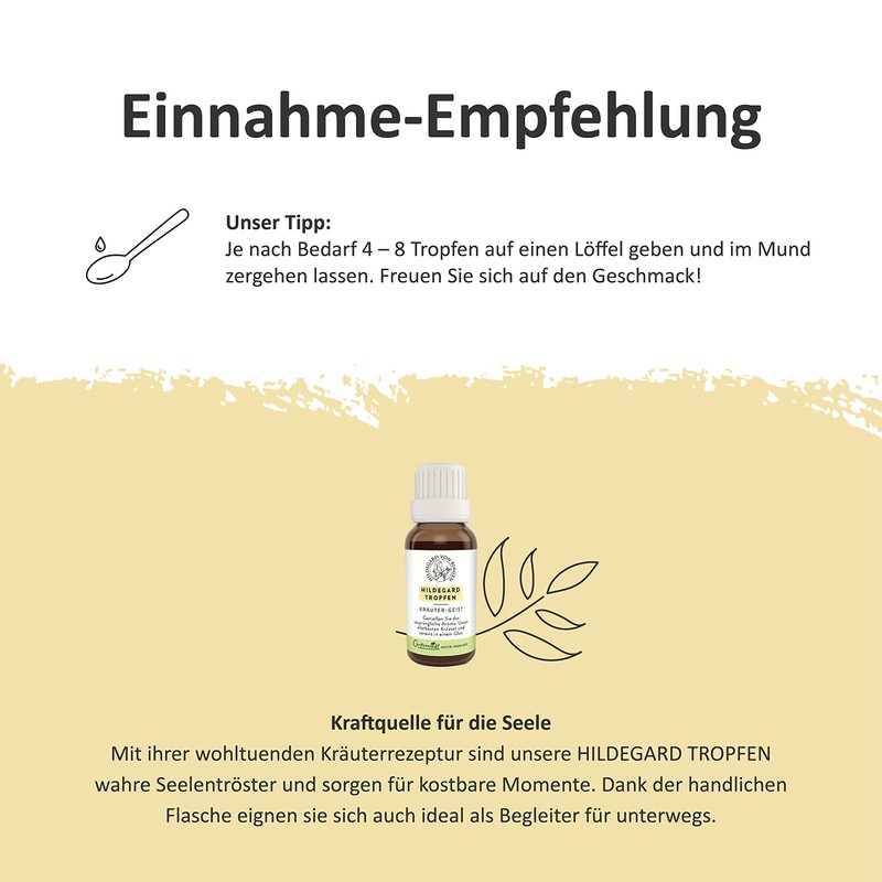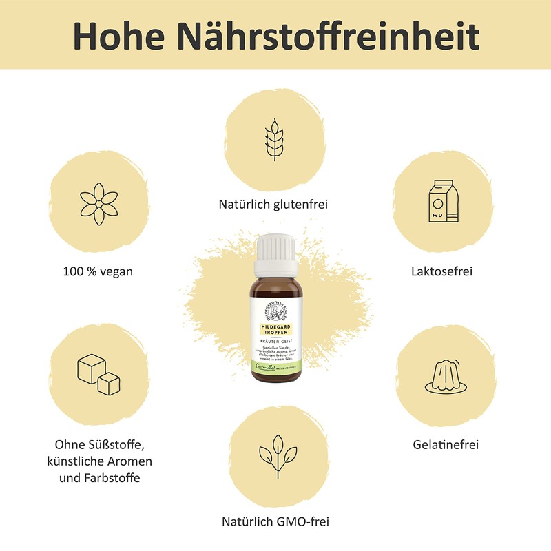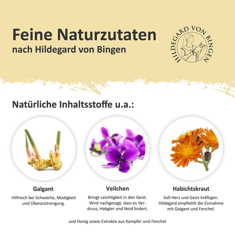 - Selected plant combination: the drops are full of sun-ripened herbs from monastery recipes of the Hildegard von Bingen. At the peak of their maturity, the plants are harvested and combine to create an excellent taste experience