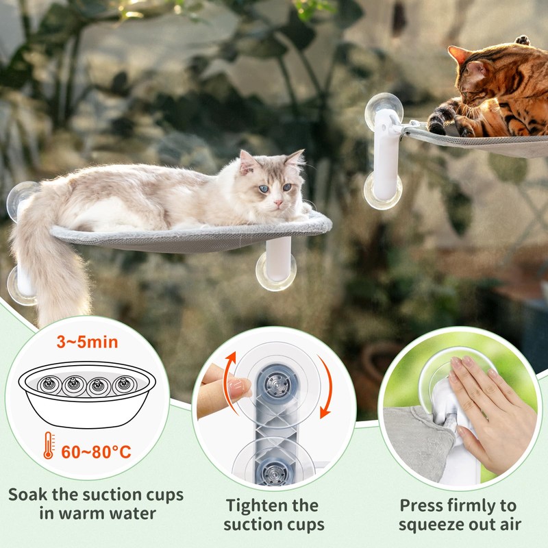- Installation Tips: Our cat window seat fits windows mesuring 23.62 in (60 cm) or wider. For best results, clean the glass, soak suction cups in warm water, and press firmly to remove air. Works on only smooth, flat surfaces such as tile or glass