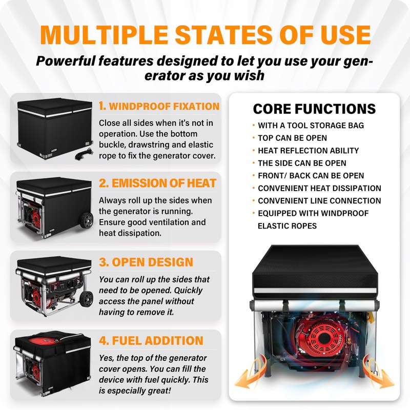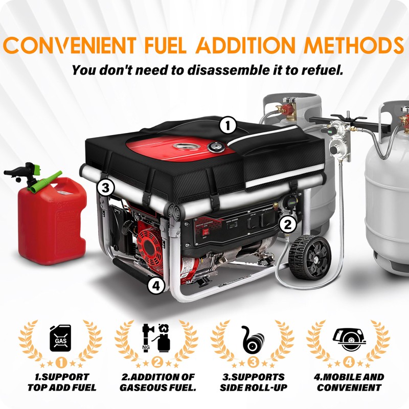 - Open Design Generator Cover: The GUYISS generator cover has an open design with the top opening for easy fuel addition. All sides open and roll up. Ensure ventilation and heat dissipation during generator operation. It is also easy to use the generator's operating buttons and link the power cord.