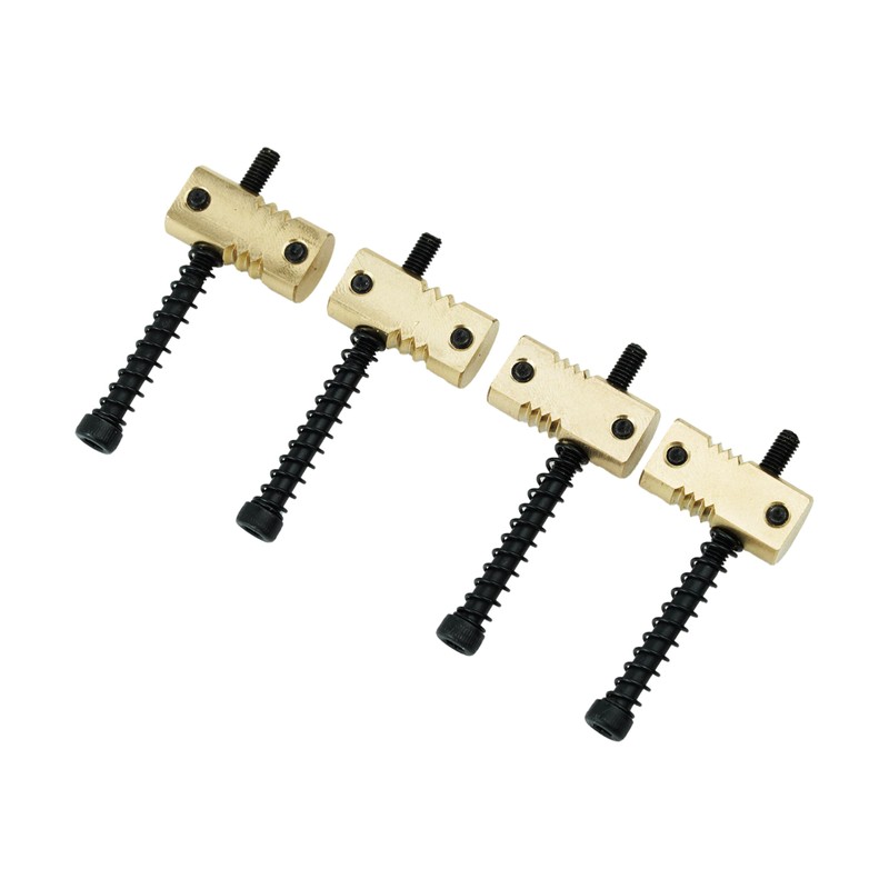 - Adjustable compensation brass bridge saddles for electric bass or other instruments.